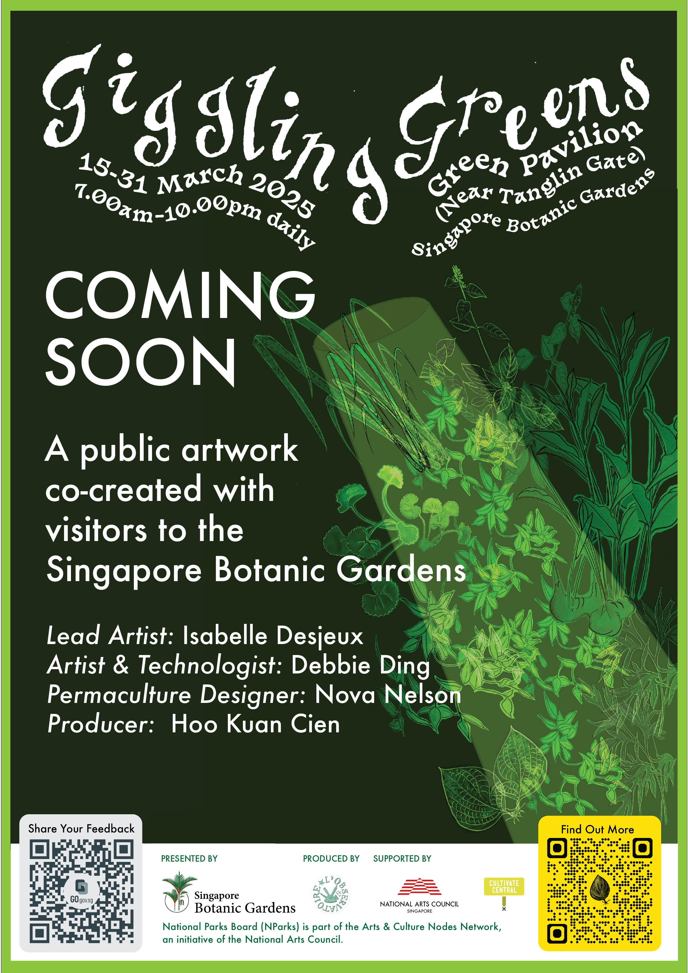 Conceived by the artist-scientist Isabelle Desjeux, and co-created with visitors to the Singapore Botanic Gardens, Giggling Greens exhibits some of Singapore’s common edible and fragrant plants for a quirky and light-hearted interaction with the public.